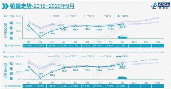 9月,國內(nèi)狹義乘用車銷量達(dá)到191.0萬輛,同比增長7.3%,三季度較去年同期實現(xiàn)約38萬輛的銷售增量;1-9月累計銷量增速下滑也收窄至12.5%,較1-8月再提升2.7個百分點。國內(nèi)乘用車市場繼續(xù)呈現(xiàn)較強的回暖趨勢。