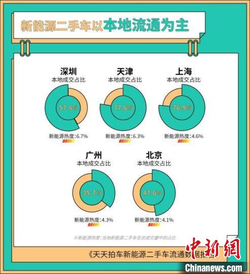 不過,在新能源二手車流通方面,本地化、區(qū)域化的交易目前仍是主要的流通方式。深圳的本地成交占比為57.8%、天津?yàn)?7.6%、上海為76.9%,從整體來看,本地成交的新能源二手車在天天拍車平臺(tái)的占比為63%,大部分的新能源二手車被本地買家買走。