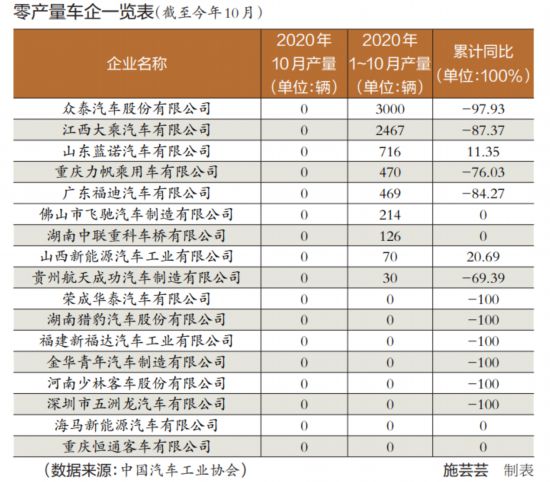 正如蔡榮華所言,我國汽車產(chǎn)銷量占全球30%左右,企業(yè)競爭日趨激烈,但是盲目投資、產(chǎn)能利用率比較低的問題尚未得到有效解決?!吨袊嚬I(yè)產(chǎn)銷快訊》(2020年第11期)數(shù)據(jù)顯示,在總共被統(tǒng)計(jì)的88家汽車企業(yè)中,今年10月汽車產(chǎn)量為零的汽車企業(yè)竟然多達(dá)17家(事實(shí)上,這一數(shù)據(jù)在8月為16家),今年前10個(gè)月產(chǎn)量低于500輛的共有25家,其中,有8家生產(chǎn)企業(yè)今年未生產(chǎn)過1輛汽車,占比接近一成。