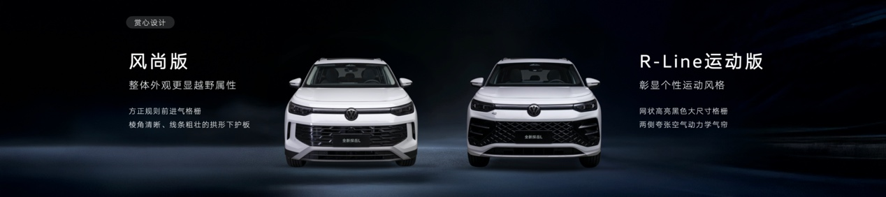 總而言之,一汽-大眾以其嚴(yán)苛的安全標(biāo)準(zhǔn)和技術(shù)創(chuàng)新,向市場(chǎng)傳遞了一個(gè)堅(jiān)定的信念:在任何情況下,安全永遠(yuǎn)是最重要的。這種對(duì)安全不計(jì)代價(jià)的執(zhí)著追求,不僅是技術(shù)上的突破,更是對(duì)每位駕乘人員的尊重與守護(hù)。 顏值扛把子:雙臉造型,一眼Crush 外觀造型上,為滿足當(dāng)下用戶多元化的審美需求,全新探岳L提供兩種前臉設(shè)計(jì)。其中,風(fēng)尚版車型的前臉?lè)秸乙?guī)則的進(jìn)氣格柵,輔以棱角清晰、線條粗壯的拱形下護(hù)板,整體外觀更顯越野屬性。相比之下,R-Line運(yùn)動(dòng)版則采用了品牌標(biāo)志性的網(wǎng)狀、高亮黑、大尺寸格柵,與兩側(cè)夸張的空氣動(dòng)力學(xué)氣簾相得益彰,賦予車輛更凌厲氣質(zhì),充分彰顯個(gè)性運(yùn)動(dòng)風(fēng)格。