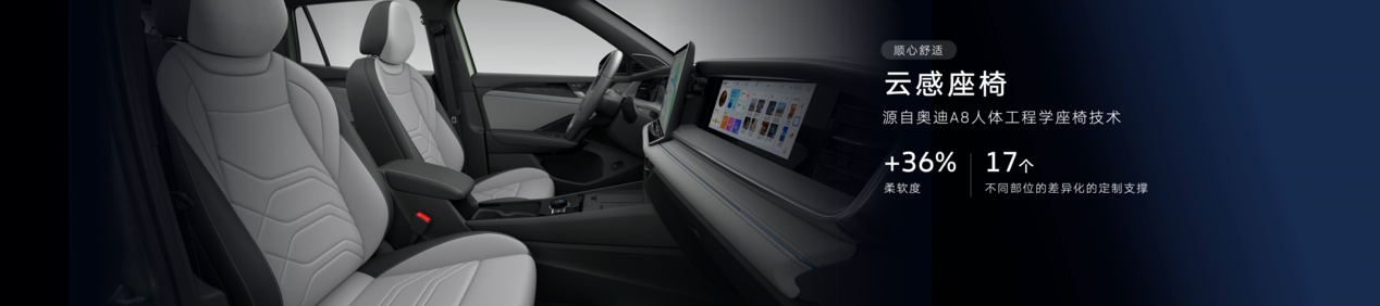 空間扛把子:不用將就,越級(jí)舒適 空間方面,全新探岳L的軸距加長(zhǎng)至2791毫米,優(yōu)秀的軸長(zhǎng)比帶來(lái)讓人驚喜的“得房率”,二排腿部空間和頭部空間均明顯領(lǐng)先同級(jí)競(jìng)品,配合二排地臺(tái)高度的降低,二排兩側(cè)的乘員可以隨便蹺二郎腿,中間乘員也能有舒適的乘坐和上下車體驗(yàn),不用將就。 舒適體驗(yàn)上,全新探岳L配備了專為中國(guó)用戶研發(fā)的云感座椅,座椅柔軟度提升了36%,坐上去可以完全放松。除柔軟外,云感座椅還擁有Audi A8同款人體工學(xué)座椅設(shè)計(jì),提供身體從靠背到大腿共17處不同部位的差異化定制支撐,即使長(zhǎng)途駕駛也不感疲憊,讓更多用戶體驗(yàn)到越級(jí)的舒適。
