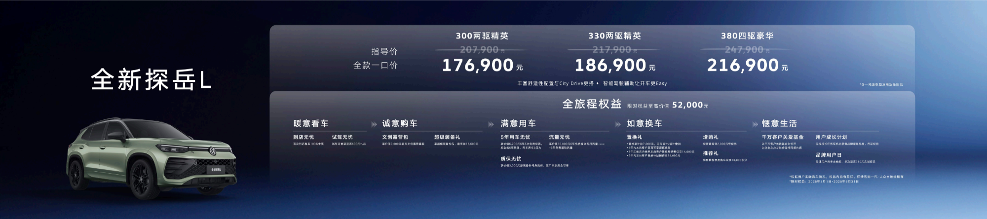 3月1日,一汽-大眾全新探岳L在五岳之首泰山震撼上市,新車共推出300TSI、330TSI、380TSI三種動(dòng)力配置共3種車型,官方指導(dǎo)價(jià)20.79萬(wàn)元起,可選裝舒適性配置豐富的City包和駕駛輔助功能Easy包?,F(xiàn)在購(gòu)買全新探岳L,還將享受17.69萬(wàn)元起的全款一口價(jià)。 2018年至今,一汽-大眾SUV家族累計(jì)銷量已近200萬(wàn)輛,構(gòu)建了產(chǎn)品數(shù)量最多、覆蓋領(lǐng)域最廣、兼具油電的SUV產(chǎn)品矩陣。為感恩千萬(wàn)用戶一路同行,值明星SUV全新探岳L煥新之際,一汽-大眾還發(fā)布了全新IP“探山攬?jiān)馈保瞥隽巳绿皆繪的上市權(quán)益大禮包,覆蓋用戶看車、購(gòu)車、用車、換車等全旅程,總價(jià)值超5萬(wàn)元,誠(chéng)意滿滿。