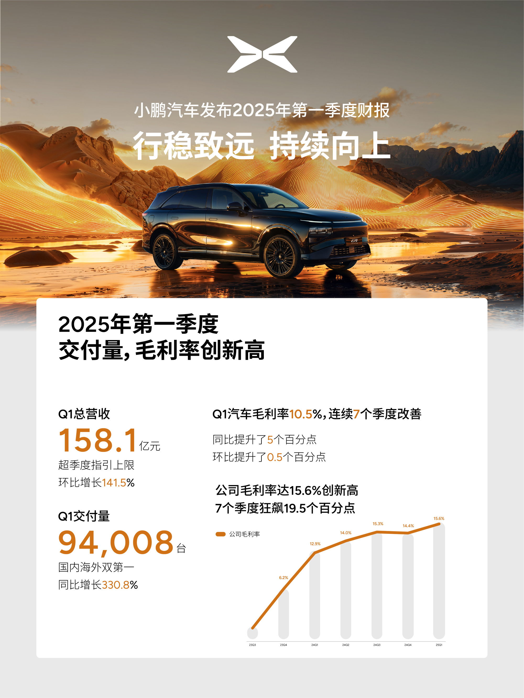 對(duì)于2025年第二季度,小鵬汽車(chē)預(yù)期,汽車(chē)總交付量將介于10.2萬(wàn)輛至10.8萬(wàn)輛,同比增加約237.7%至257.5%;總營(yíng)收將介于人民幣175億元至人民幣187億元,按年增加約115.7%至130.5%。