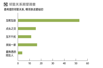 除了以上硬件設(shè)施環(huán)境,鄰里關(guān)系這樣的軟性條件也極大影響人們居住質(zhì)量。和“年輕人不愛社交”這樣的普遍認(rèn)知不同,調(diào)研發(fā)現(xiàn)53%受訪者期待互幫互助的鄰里關(guān)系,更有16.5%的人希望和鄰居親如一家?!斑h(yuǎn)親不如近鄰”,在當(dāng)下依然沒有過時(shí)。