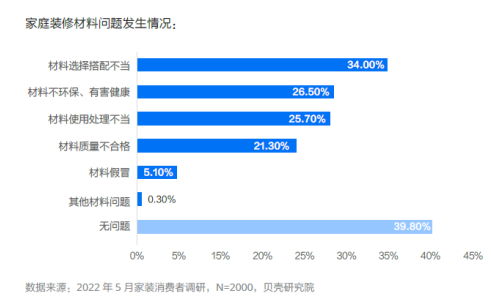 報(bào)告顯示,有超過六成的家裝消費(fèi)者曾遇到過材料問題,其中既有涉及材料本身的問題,例如材料不環(huán)保有害健康(26.5%)、材料質(zhì)量不合格(21.3%)、以及材料假冒(5.1%);也有涉及材料使用的問題,例如材料選擇搭配不當(dāng)(34%)、材料使用處理不當(dāng)(25.7%)等。