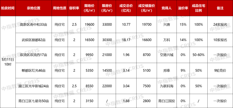 據(jù)中指研究院監(jiān)測,本次出讓中,只有2宗宅地位于主城區(qū),其獲得關(guān)注熱度高、參拍企業(yè)多。最終,高新區(qū)南中和33畝宗地和武侯區(qū)麗都82畝宗地價格達到觸頂“熔斷”,分別由興唐地產(chǎn)和萬科以樓面價19700元/平方米、16600元/平方米搖中。