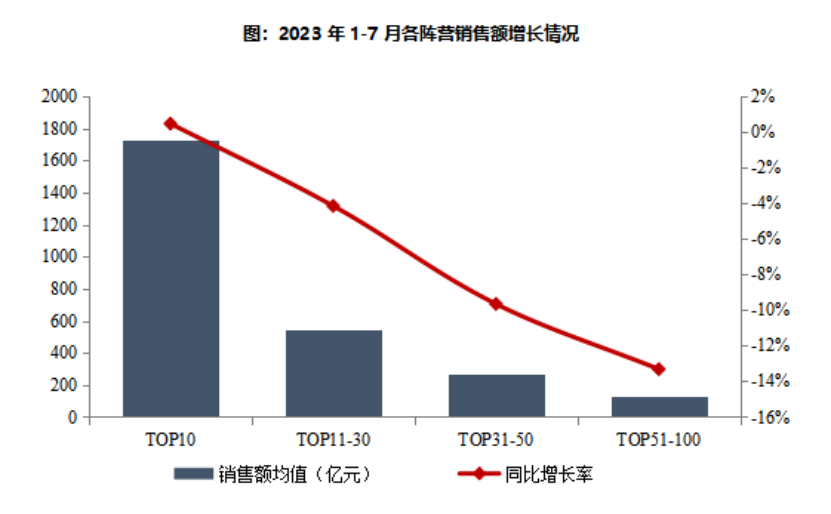 (圖源:中指研究院,央廣網(wǎng)發(fā)) 2023年1-7月,百億以上陣營(yíng)企業(yè)數(shù)量減少。具體來(lái)看,千億以上陣營(yíng)10家,與去年同期持平,銷售額均值1725.5億元。第二陣營(yíng)(500-1000億)企業(yè)7家,較去年同期減少4家,銷售額均值785.8億元。第三陣營(yíng)(300-500億)企業(yè)20家,較去年同期增加1家,銷售額均值383.5億元。第四陣營(yíng)(100-300億)企業(yè)為48家,較去年同期減少3家,銷售額均值171.0億元。 中指研究院市場(chǎng)研究總監(jiān)劉水分析稱,重點(diǎn)房企銷售同比、環(huán)比均明顯下降。同時(shí),千億房企數(shù)量基本穩(wěn)定,其他各陣營(yíng)房企數(shù)量明顯減少。他還提到,頭部房企業(yè)績(jī)韌性強(qiáng),腰部及尾部房企銷售有不同程度下降。 中指研究院數(shù)據(jù)顯示,2023年1-7月,TOP10房企銷售額均值為1725.5億元,較上年增長(zhǎng)0.5%;TOP11-30房企銷售額均值為544.7億元,較上年下降4.2%;TOP31-50房企銷售均值為271.2億元,較上年下降9.7%;TOP51-100房企銷售額均值為127.4億元,同比下降13.3%。