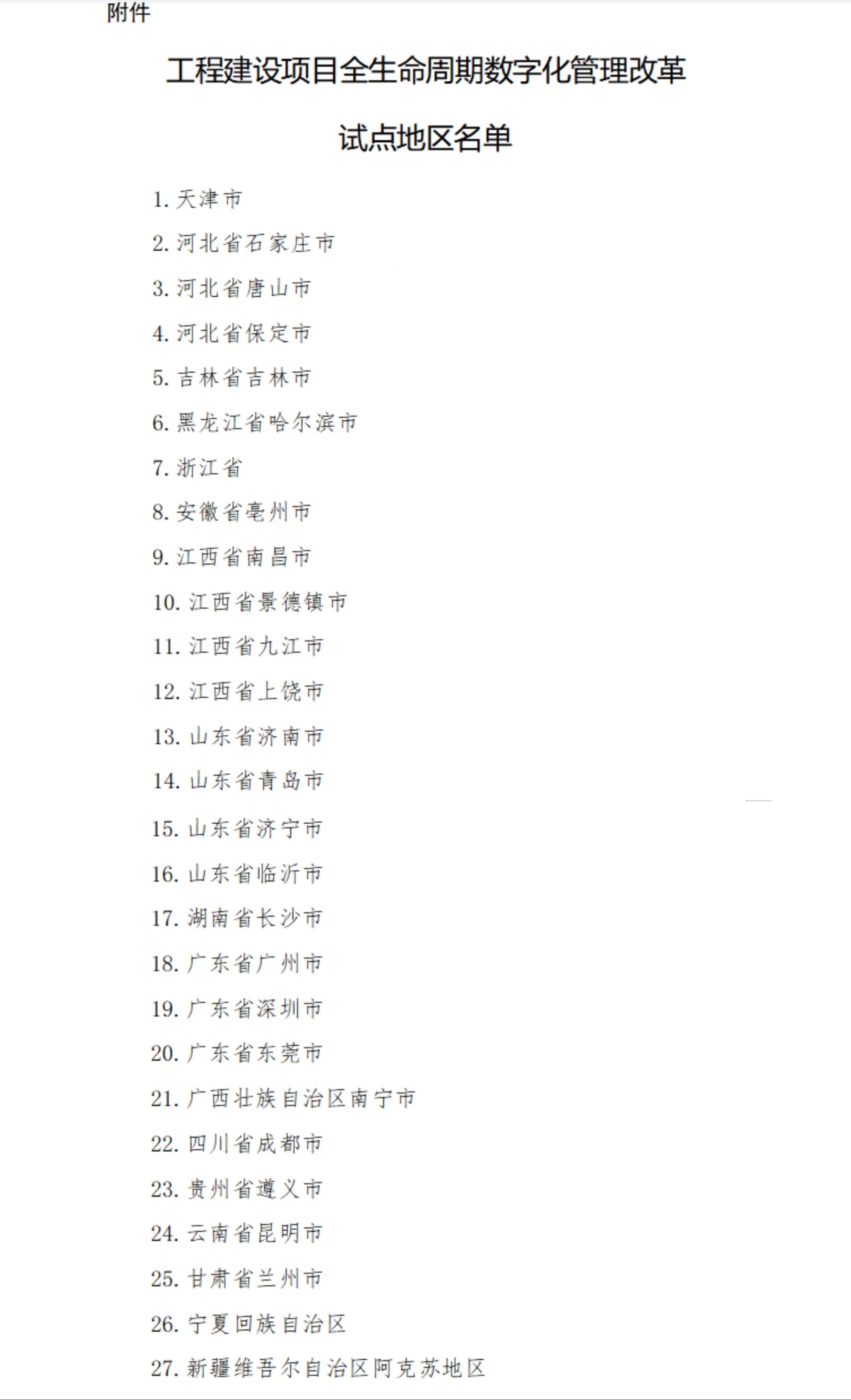 | 住建部:在天津等27個地區(qū)開展工程建設(shè)項目全生命周期數(shù)字化管理改革試點(diǎn)工作 |