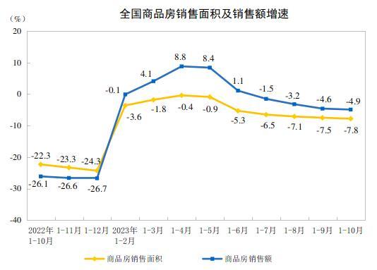 1—10月份,商品房銷售面積92579萬平方米,同比下降7.8%,其中住宅銷售面積下降6.8%。商品房銷售額97161億元,下降4.9%,其中住宅銷售額下降3.7%。