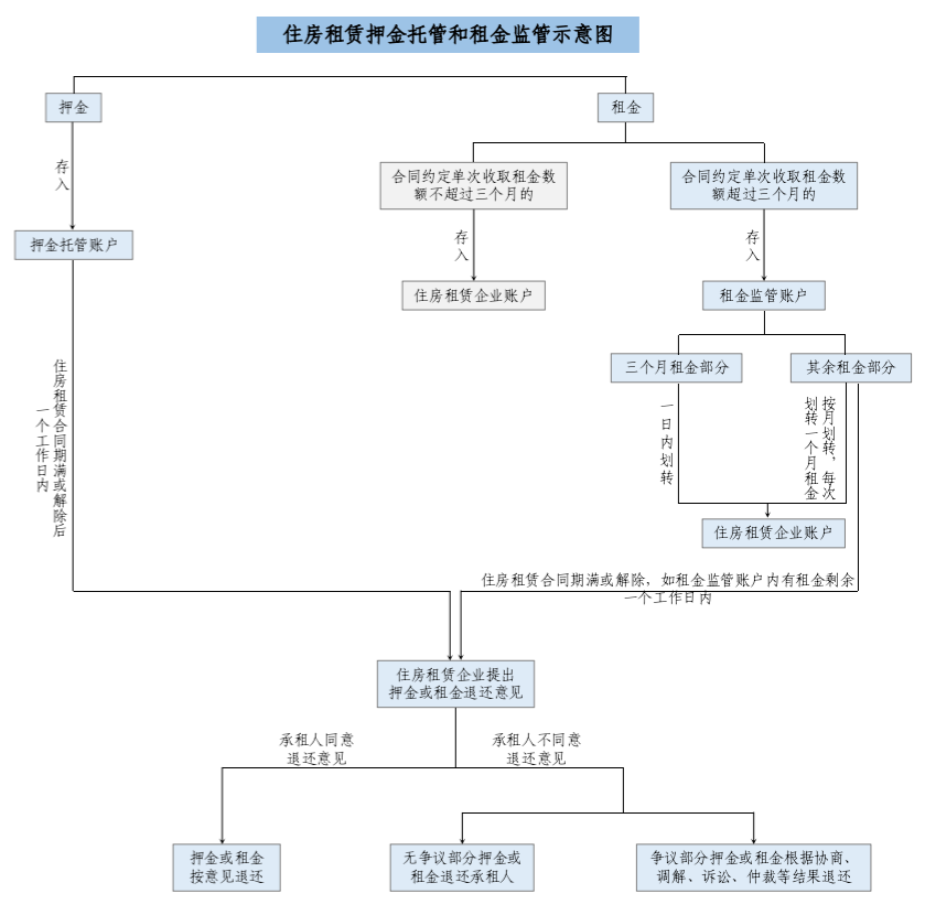 《征求意見稿》規(guī)定,押金按照住房租賃合同約定的時間、金額存入押金托管賬戶,租金方面,單次收取租金數(shù)額超過三個月的,租金按照合同約定時間、金額存入租金監(jiān)管賬戶。其中三個月租金部分在一日內(nèi)劃轉(zhuǎn)至住房租賃企業(yè)賬戶,其余租金按月劃轉(zhuǎn),每次劃轉(zhuǎn)金額為一個月租金。