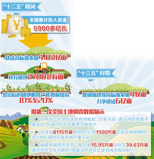 同時(shí),對(duì)耕地的建設(shè)性保護(hù)也迫在眉睫。“建設(shè)性保護(hù)指通過工程措施改善耕地質(zhì)量。”中央農(nóng)辦副主任韓俊介紹,近年來,國家大力推進(jìn)土地整治與高標(biāo)準(zhǔn)農(nóng)田建設(shè),有效彌補(bǔ)了耕地產(chǎn)能損失。僅高標(biāo)準(zhǔn)農(nóng)田建設(shè)一項(xiàng),“十二五”期間,全國累計(jì)投入資金5900多億元,建成高標(biāo)準(zhǔn)農(nóng)田4.03億畝,補(bǔ)充耕地2700多萬畝,整治后的耕地糧食產(chǎn)能普遍提高10%至20%?!笆濉睍r(shí)期,要確保建設(shè)高標(biāo)準(zhǔn)農(nóng)田4億畝,力爭建成6億畝。