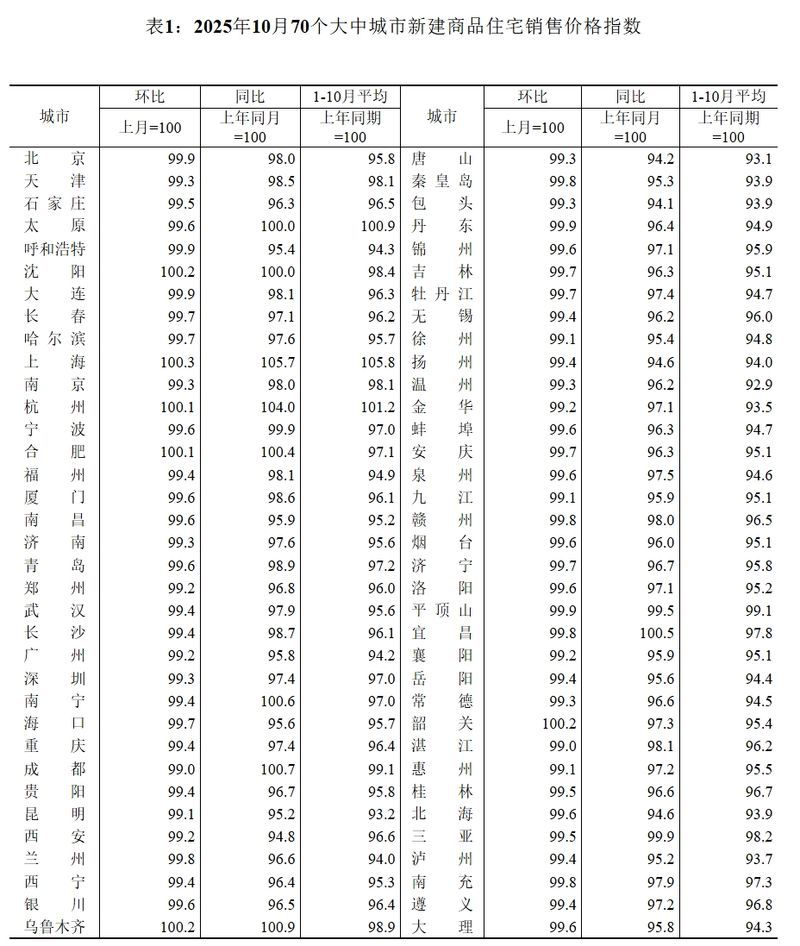 據(jù)國家統(tǒng)計局?jǐn)?shù)據(jù),10月份,一線城市新建商品住宅銷售價格環(huán)比下降0.3%,降幅與上月相同。其中,上海上漲0.3%,北京、廣州和深圳分別下降0.1%、0.8%和0.7%。二線城市新建商品住宅銷售價格環(huán)比下降0.4%,降幅與上月相同。三線城市新建商品住宅銷售價格環(huán)比下降0.5%,降幅擴(kuò)大0.1個百分點。