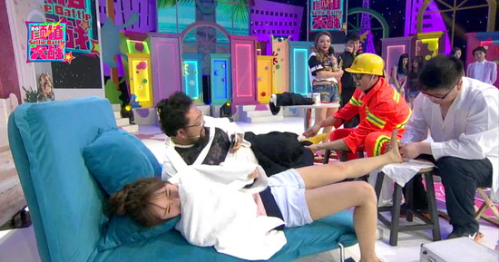 更悲慘的還在后面等著修睿。原地做造型自拍都困難無比,身子完全掌握不到平衡,直接踹翻道具椅,颶風(fēng)碉堡更是變成一座阻擋他前進(jìn)的大山,一步兩步往前跳,努力自拍擺造型,無奈實(shí)在抵擋不住勁風(fēng),直接單膝跪地整個(gè)人撲倒。和美女體驗(yàn)情景自拍,抽到“撲倒與被撲倒”,被搭檔嫌棄還要忍受撓腳心的煎熬,拍出驚悚照被張大大、小甜甜一陣暴風(fēng)吐槽。而喬杉則和一貫的老搭檔小甜甜再度演繹情景,兩人同吃小香腸自拍,一邊喬杉被撓腳心哭笑不得,氣得搶下按摩器直敲“按摩師”。