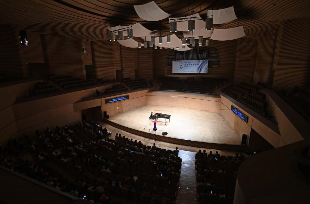 當(dāng)日,首屆天津音樂(lè)節(jié)推出“唱支山歌給黨聽(tīng)”民族歌劇選段音樂(lè)會(huì),天津歌舞劇院的演員們?cè)谔旖虼髣≡撼憽逗楹舜蚶恕贰都t梅贊》《唱支山歌給黨聽(tīng)》等經(jīng)典曲目。