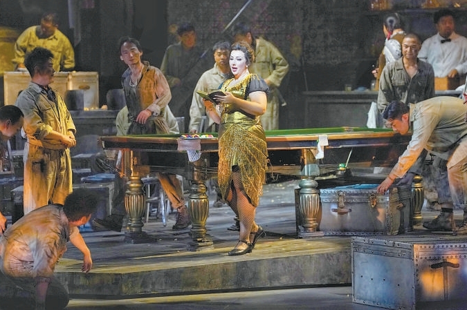 國家大劇院一向注重歌劇的視覺效果,《西部女郎》也不例外。劇目盡可能還原了礦工聚集的酒館、二層的房屋、蒼莽的森林,是劇情氣氛的有力補充,讓觀眾有身臨其境之感。只是,第一幕中酒館的布景在視覺上顯得有點“滿”,舞臺上高高堆疊的箱子雖有立體感,但占據了大部分視野,再加上第一幕的故事與音樂敘事感很強,復雜的布景略微有點干擾觀眾對音樂的捕捉。反而第二幕、第三幕二層房屋、森林的設計極具現代感,充分運用了舞臺空間和假定性的想象,風格上也簡潔明了,引人入勝。