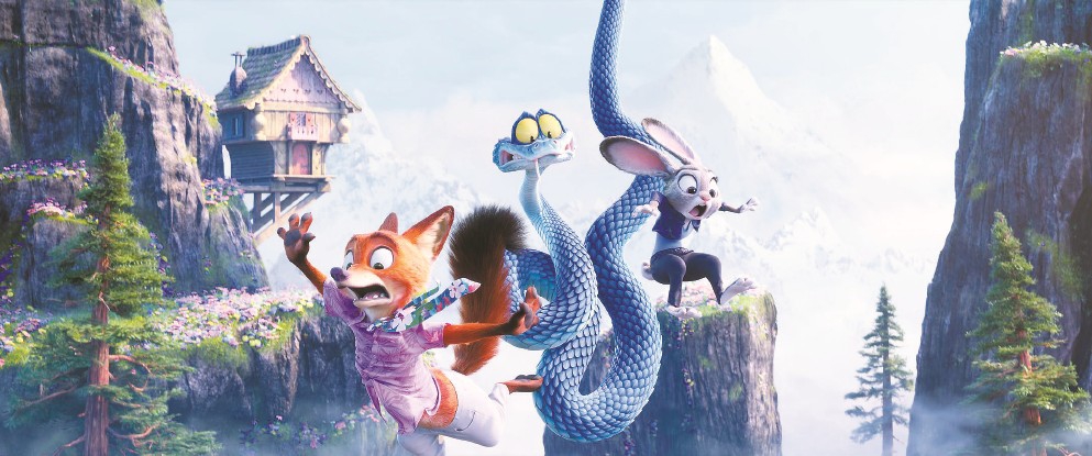 不過《瘋狂動物城2》的“奔跑”意涵并不會上升到《羅拉快跑》的哲思層面。動物們的一路狂奔自然也是為了成就影片的“好看”。從冰山雪川到熱帶雨林,從沙漠風(fēng)生到沼澤水起,汽車追逐要的是光怪陸離的街景,水里逃生要的是窒息壓迫的氛圍,冰雪對決要的是蒼茫一片的天地。觀眾們的視線跟隨著動物角色的行動高速地移轉(zhuǎn),從一個驚奇進(jìn)入下一個驚奇,從一處景觀轉(zhuǎn)入下一個景觀,這種步移景換的觀看,與他們在迪士尼游樂園里進(jìn)行沉浸式大型項(xiàng)目的體驗(yàn)非常相似。只不過,目迷五色的“眩暈”體驗(yàn)從5分鐘延長到了100分鐘。未來的一個市場可能大概是,人們會有機(jī)會在某處的迪士尼樂園項(xiàng)目中重溫熟悉而親切的瘋狂動物城記憶。