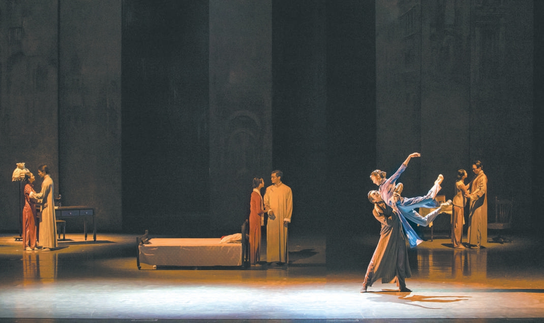 《永不消逝的電波》是韓真、周莉亞這對“舞壇雙子星”較早“出圈”的舞劇,在觀眾心中留下了很多經(jīng)典舞段。十余位身穿旗袍、手持蒲扇的女舞者,在《漁光曲》的旋律中曼妙起舞,浸透老上海風(fēng)情;與之產(chǎn)生強烈對比的是,披著黑色斗篷的特務(wù)在冷雨夜展開驚心動魄的追捕;李俠與蘭芬從假扮夫妻到發(fā)展為真正的愛人,幾對舞者的雙人舞同臺綻放。這些片段時常在舞蹈愛好者腦海中盤旋。