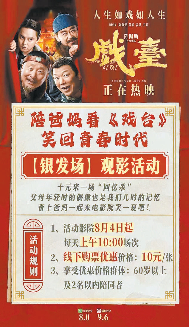 《戲臺》則推出“銀發(fā)場”特惠活動?!靶Ч貏e好,線上線下都傳開了,很多觀眾打電話來咨詢。”馮賀楠說,北京大約四分之一的影院都有“銀發(fā)場”,他所在影院的“銀發(fā)場”上座率在《戲臺》所有場次中是最高的。 (北京晚報記者 袁云兒)