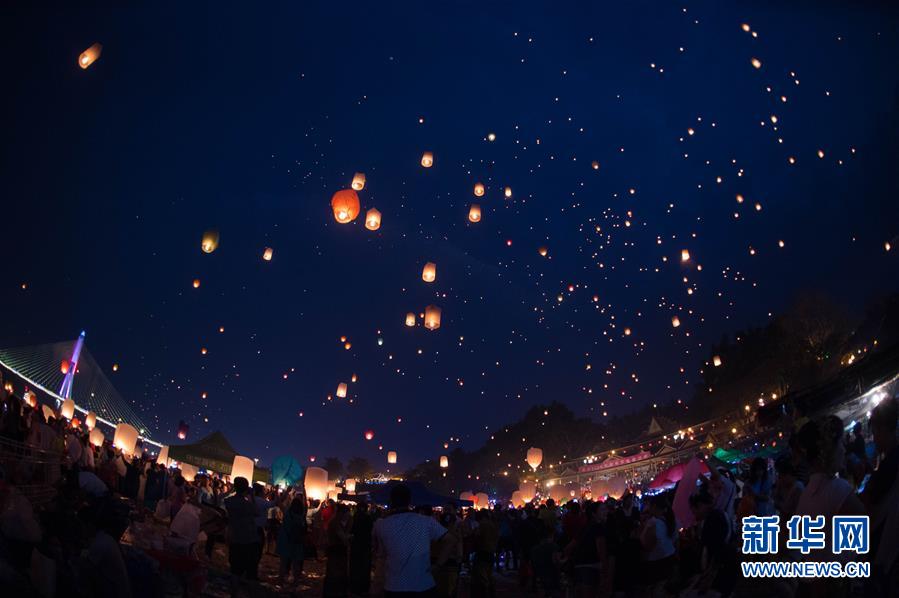 當日,各族群眾和國內外游客在云南西雙版納景洪市瀾滄江畔放飛孔明燈,喜迎傣歷1378年新年。