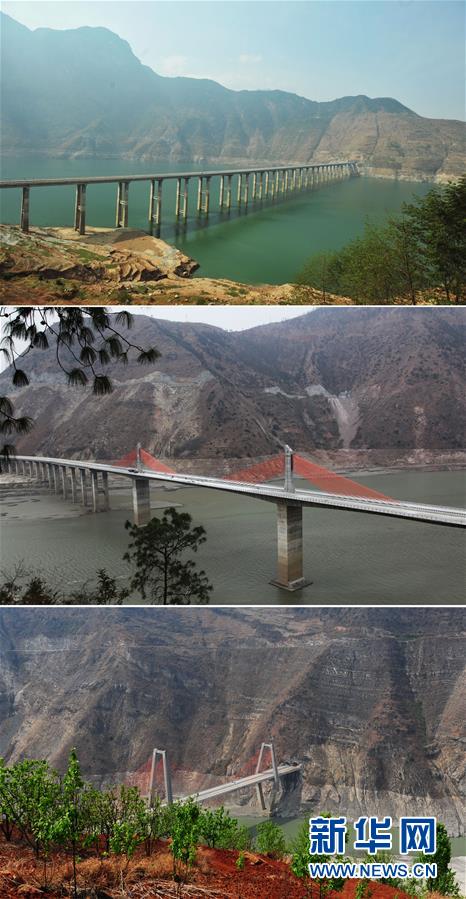 雅西高速瀑布溝庫(kù)區(qū)路段3座跨大渡河特大橋:青杠嘴特大橋(上圖)、觀音巖特大橋(中圖)、蘇村壩特大橋(下圖,拼版照片,攝于2012年4月12日)。1935年5月24日、25日間,紅軍“十七勇士”在槍林彈雨中,以一條木船強(qiáng)行從安順場(chǎng)渡河,在國(guó)民黨軍視為天險(xiǎn)的大渡河防線上,撕開(kāi)了一個(gè)缺口,為紅軍沿大渡河兩岸夾河北上奪占瀘定橋創(chuàng)造了有利條件。 “紅軍不怕遠(yuǎn)征難,萬(wàn)水千山只等閑?!遍L(zhǎng)征譜寫(xiě)了一曲人類(lèi)征服自然的凱歌,峽谷激流、雪山草地、物資匱乏、生命禁區(qū),這一切都不能阻擋紅軍前進(jìn)的步伐。80年過(guò)去,滄海桑田,紅軍長(zhǎng)征走過(guò)的荒郊野嶺,如今樓宇林立,欣欣向榮;徒步翻越的大山、攻克的關(guān)隘、沼澤遍布的草地、泅渡的河流,修起了通暢快捷的公路和大橋……長(zhǎng)征之路發(fā)生了翻天覆地的變化,昔日的艱難險(xiǎn)阻正漸漸變成康莊通途。新華社記者江宏景攝