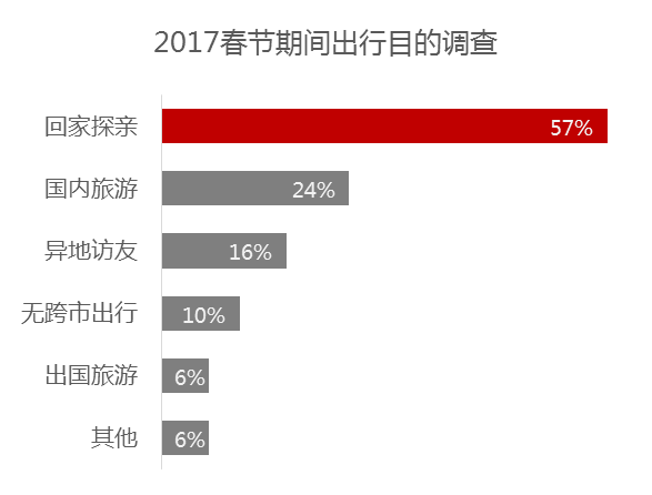 《報告》關于2017年春節(jié)跨市出行(長途出行)意愿的在線問卷調(diào)查數(shù)據(jù)顯示,“回家探親”是受訪者春節(jié)期間長途出行的第一大動機,“國內(nèi)旅游”則是第二大出行動機??傮w而言,受訪者能夠明確給出的春節(jié)出行動機中,除了“回家探親”,就是旅游(國內(nèi)游和出境游)。這表明,居民2017年春節(jié)期間的旅游消費意愿強烈,旅游過年已經(jīng)成為較為主流的過年方式。