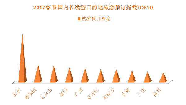 一般情況下,春節(jié)期間的國內(nèi)長線游(行程3日以上,居住地300公里外)需求的出游人數(shù)在總體長線游需求中占比最大?!秷蟾妗窋?shù)據(jù)顯示,北京、哈爾濱、長白山、廈門、廣州、牡丹江、亞布力、吉林、三亞、昆明是2017年春節(jié)期間最熱門的十個目的地(以《報告》發(fā)布時的線路預訂數(shù)據(jù)統(tǒng)計),其中哈爾濱、長白山、牡丹江、亞布力、吉林五個目的地全部來自東北地區(qū),春節(jié)期間冰雪游線路的火爆是它們上榜的共同原因,廈門、三亞、昆明等則為黃金周國內(nèi)游傳統(tǒng)熱門目的地。另外,不同城市居民春節(jié)國內(nèi)長線游的目的地偏好略有差異,例如,北京最受歡迎的春節(jié)國內(nèi)游目的地主要有廣州、珠海、哈爾濱、長白山,上海最受歡迎的春節(jié)國內(nèi)游目的地主要有長白山、北海、三亞、北京等,廣州最受歡迎的春節(jié)國內(nèi)游目的地主要有貴陽、張家界等。