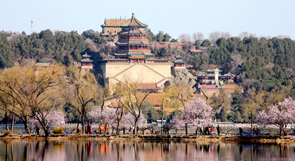 2024年3月19日,北京頤和園西堤,山桃花爭相盛開,與古建亭橋相映成景。丁幫學(xué)攝(人民圖片網(wǎng))