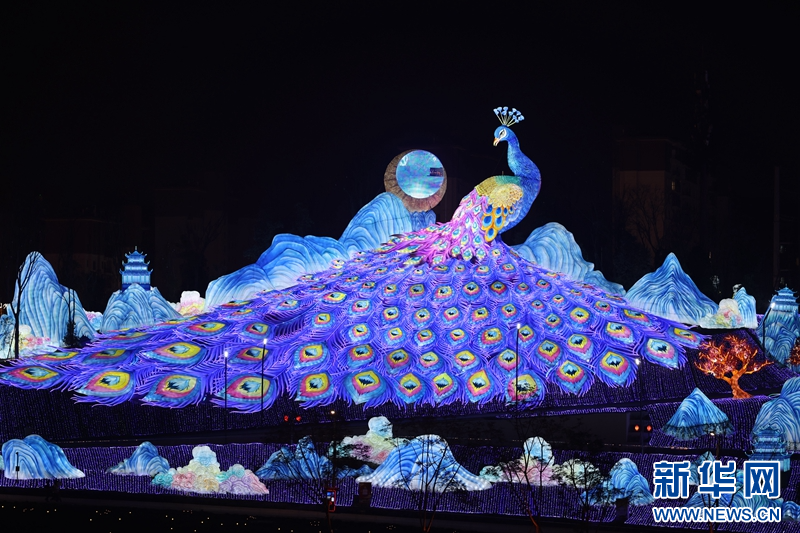 圖為1月13日拍攝的《孔雀合屏》燈組。新華網(wǎng)發(fā)(曹鵬 攝)