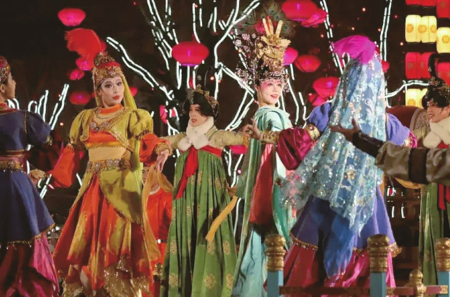 有才華的游客可以在《盛唐密盒》處舉手示意,與演員互動(dòng);喜歡李白的游客可以在《詩(shī)歌藝術(shù)》處與李白 對(duì)詩(shī);《花車 斗彩》處西域胡姬與大唐美女現(xiàn)場(chǎng)斗舞,彰顯盛唐時(shí)期絲路文化和盛唐文化的和諧交融,仿佛到了古裝電視劇中的上元節(jié);《貞觀之治》處則可感受李世民時(shí)期萬國(guó)來朝賀的盛世景象;一路有行為藝術(shù),《武士雕刻》《奮斗在路上》《畫中人》《戲演壁畫》等讓人目不暇接,一路走走停停,到達(dá)最南端的開元廣場(chǎng),就可以看一場(chǎng)大唐不夜城場(chǎng)地最大、演員最多、時(shí)間最長(zhǎng)的表演《再回長(zhǎng)安》,感受大詩(shī)人白居易回長(zhǎng)安的盛大氛圍;開元廣場(chǎng)東側(cè)不倒翁小姐姐表演,周圍也圍著很多游客,不遠(yuǎn)萬里前來一睹小姐姐美麗的身姿。