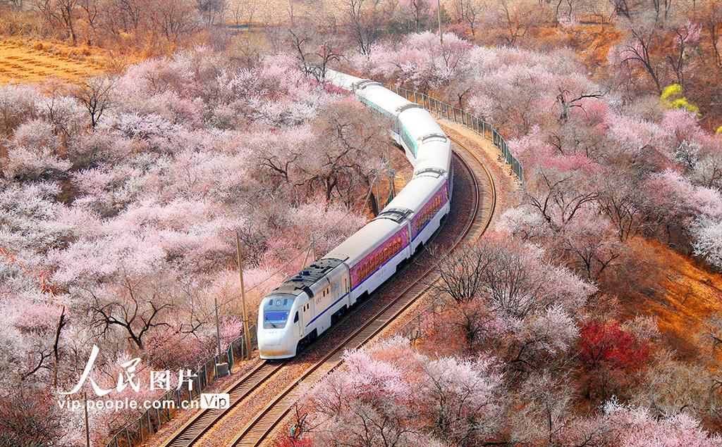 2025年3月23日,居庸關(guān)長城腳下繁花似錦,北京市郊鐵路S2線列車悠然穿行其間,該線列車因途經(jīng)多處風(fēng)景名勝,被贊譽為“開往春天的列車”。張秀科攝(人民圖片網(wǎng))