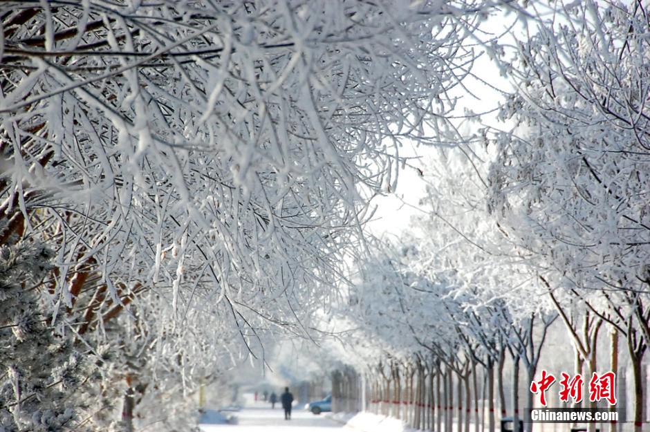 受寒潮低溫的影響,甘肅省玉門市城鄉(xiāng)近期普降中到大雪,寒流使這里大片的樹木上形成美麗的霧凇,十分壯觀,吸引眾多市民走出戶外欣賞美麗的霧凇美景。萬宗平 攝