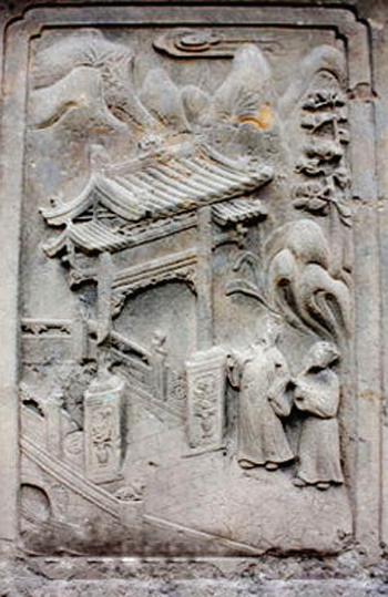 配坊實(shí)際上是一座功名石牌坊,上面刊載著武訪疇一家四代人的姓名及朝廷贈封的官爵,咸豐六年(1856)由武訪疇修建。這座石雕牌坊與其它牌坊最大的區(qū)別就是沒有題刻坊名,因此只能稱之為配坊。坐北向南,為四柱三間三樓單檐歇山頂結(jié)構(gòu),牌樓高8米,寬12米,坊體坐落在近1米高的長方形臺基上,立柱仍然采用夾柱石固定。坊頂覆蓋青瓦,正脊飾石雕貔貅裝飾,飛檐翹角,明樓檐下為“圣旨”牌,當(dāng)心間設(shè)兩層小字板,第一層題刻:“贈資政大夫曾祖父廷桂,贈夫人曾祖母李氏;誥贈資政大夫祖父秉壁,誥贈夫人祖母吳氏;誥贈資政大夫父烈,誥封夫人母朱氏。陜西分巡延榆綏兵備道、加四級武訪疇謹(jǐn)建。”第二層題刻“大清咸豐六年歲次丙辰仲夏上院榖旦”。武訪疇借建坊要弘揚(yáng)祖輩陰德,而祖輩的姓氏大名又不能題刻在母親的節(jié)孝牌坊上,所以,他必須另建一坊才能完整地表達(dá)心愿。實(shí)際上,這就是建造配坊的真正目的。也正因此在配坊題刻“龍光錫寵”、“鳳詔褒榮”、“克成先志”、“重裕后昆”等。