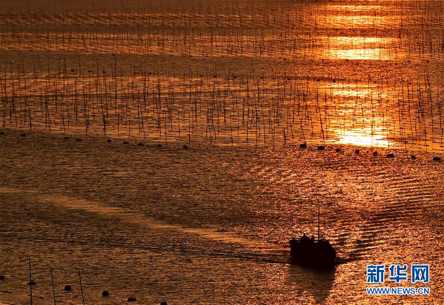 12月9日,夕陽西下,一艘漁船穿行在海上紫菜養(yǎng)殖架間。福建省寧德市的霞浦縣以美麗的淺海、灘涂聞名,豐富的旅游資源和人文資源一直是攝影師追逐的靈感所在。 新華社記者魏培全攝