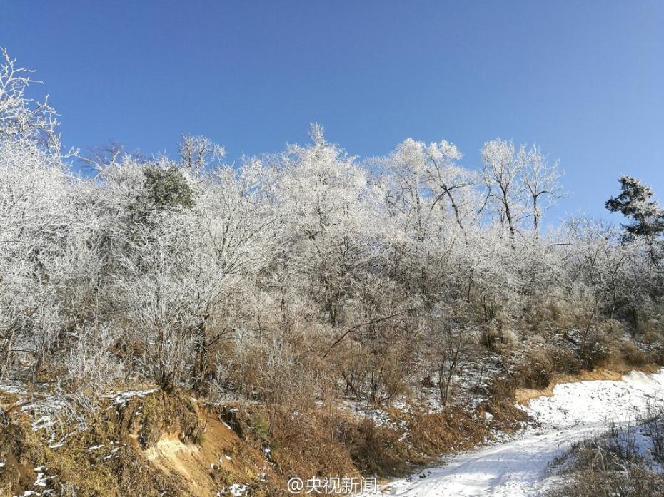 受較強(qiáng)冷空氣影響,秦嶺腹地涼風(fēng)埡山頂,出現(xiàn)大面積霧凇景觀。玉樹(shù)瓊枝,晶瑩剔透,讓涼風(fēng)埡山頂變得像童話(huà)世界一般,美不勝收。 央視記者王志杰 圖片來(lái)源:央視新聞微博