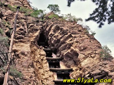 北洞是主體建筑部分。中區(qū)有大殿三間,座北向南。原為道教三清塑像,后被佛教改成三世佛。左右耳殿,另有東西配殿各三間,南閣一間。東側(cè)迎面山壁上,自然形成龐大的三角形石縫,內(nèi)有天然石洞,景觀奇特。石縫上端,外建五層樓閣。依崖開鑿卯洞,梁架結(jié)構(gòu)與崖石交接構(gòu)筑,建造精巧。閣內(nèi)設(shè)有鐵索,扶鐵索可攀援而上。在閣的東邊又有一洞,內(nèi)建殿三間,名九仙女閣,塑九仙女像。箭閣外塑趙杲泥像,頭頂距石崖僅二指半,故舊稱“趙杲觀,離天二指半”。再往南,就是趙杲觀最險(xiǎn)峻的景觀了。峭峰高處,半山腰中,山洞前面,建樓三間。一眼望去,高閣懸空,上峭崖,下絕壁,左右山石如刀削。上下左右根本無路可通。山洞中垂下一條長約20米的鐵索,成了進(jìn)洞的唯一途徑。只有勇敢的虔誠者或探險(xiǎn)者,方可垂直攀索而登,一般人只能望樓興嘆,故鐵索被譽(yù)為“仙閣云梯”。三層樓建筑后依山洞,前為磚木結(jié)構(gòu)。上層內(nèi)塑太上老君、無始天尊、通天教主。中層內(nèi)塑關(guān)圣帝君。下層供修持者居住。當(dāng)時(shí)修筑情景,真令人難以想像。北洞群落,地形險(xiǎn)要,峰巒競秀,古木參天,峭峻幽邃,設(shè)計(jì)大膽,造型奇特。人夸“雁北懸空寺,不及代州趙杲現(xiàn)”說的并不過分。