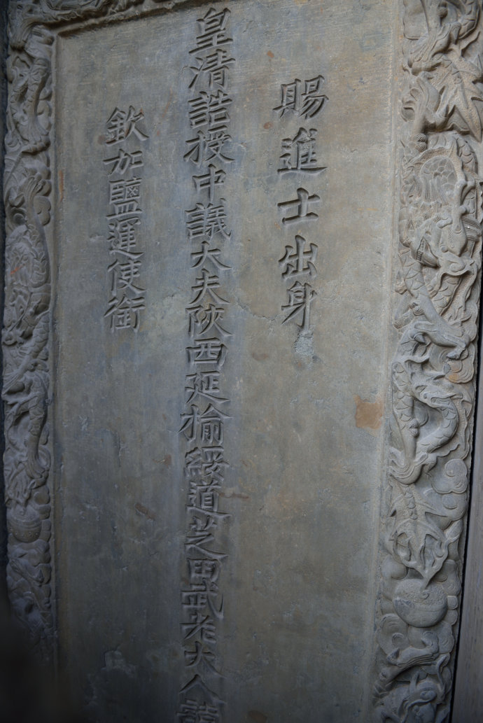 配坊實際上是一座功名石牌坊,上面刊載著武訪疇一家四代人的姓名及朝廷贈封的官爵,咸豐六年(1856)由武訪疇修建。這座石雕牌坊與其它牌坊最大的區(qū)別就是沒有題刻坊名,因此只能稱之為配坊。坐北向南,為四柱三間三樓單檐歇山頂結(jié)構(gòu),牌樓高8米,寬12米,坊體坐落在近1米高的長方形臺基上,立柱仍然采用夾柱石固定。坊頂覆蓋青瓦,正脊飾石雕貔貅裝飾,飛檐翹角,明樓檐下為“圣旨”牌,當(dāng)心間設(shè)兩層小字板,第一層題刻:“贈資政大夫曾祖父廷桂,贈夫人曾祖母李氏;誥贈資政大夫祖父秉壁,誥贈夫人祖母吳氏;誥贈資政大夫父烈,誥封夫人母朱氏。陜西分巡延榆綏兵備道、加四級武訪疇謹建。”第二層題刻“大清咸豐六年歲次丙辰仲夏上院榖旦”。武訪疇借建坊要弘揚祖輩陰德,而祖輩的姓氏大名又不能題刻在母親的節(jié)孝牌坊上,所以,他必須另建一坊才能完整地表達心愿。實際上,這就是建造配坊的真正目的。也正因此在配坊題刻“龍光錫寵”、“鳳詔褒榮”、“克成先志”、“重裕后昆”等。