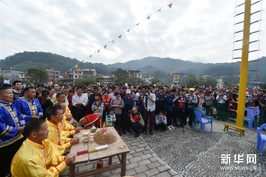 農(nóng)歷十月十五前后,福建西部武平縣各山村陸續(xù)進(jìn)入農(nóng)閑時(shí)節(jié)。按照當(dāng)?shù)仫L(fēng)俗,不同村子各自擇日舉辦民間活動(dòng),其中較有代表性的就是“上刀山”絕技?!吧系渡健苯^技在閩西山村流傳已有數(shù)百年歷史,表演者需光腳順著磨得鋒利閃亮的36把鋼刀,攀登至8米高的杉木柱子頂部,接受長(zhǎng)者祝福,祈求風(fēng)調(diào)雨順、五谷豐登。新華社記者 宋為偉 攝