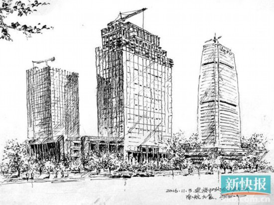 在白云區(qū)的藍(lán)天花園展覽室內(nèi),新快報記者看到了吳立中筆下的《日新月異的白云新城鋼筆速寫畫》系列畫作,從舊機(jī)場到總部經(jīng)濟(jì)集聚區(qū),白云新城經(jīng)過多年的規(guī)劃和建設(shè),城市發(fā)展骨架漸次成型,綠地中心、南方航空大廈、白云萬達(dá)廣場、云璟匯,以及廣州體育館、廣州市兒童公園、白云國際會議中心等建筑地標(biāo)的蛻變軌跡清晰可見。