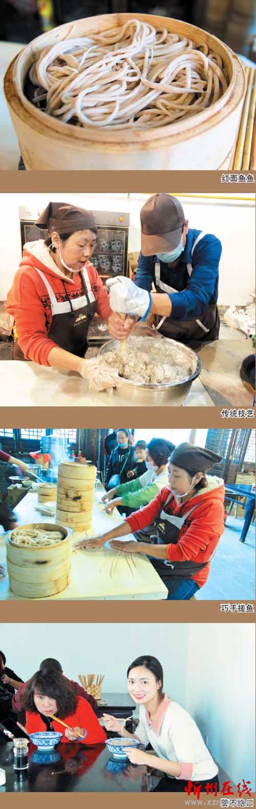 這家店的女主人叫康秀蘭,今年51歲,忻府區(qū)豆羅鎮(zhèn)韓溝村人。秀蘭從小勤快,幫助母親洗鍋做飯,學搓魚魚。18歲時便遠近聞名,掌握了搓魚魚的好手藝。在今年忻州古城招商比賽入圍的6家店鋪中,秀蘭的小店脫穎而出,奪得第一名,拿到了開門店的資格。眼下夫妻二人經(jīng)營著兩間大的門臉兒,小籠屜蒸魚魚,臊子有鮮肉蘑菇、西紅柿和老酸菜湯,食客們可根據(jù)自己的喜好選擇。他們兩口子既當老板又是廚師。在食客多時臨時雇幾個幫工,小生意做得風生水起??敌闾m告訴筆者,自開張以來食客不斷增加,國慶節(jié)假期期間一天的最高銷售紀錄是賣出200多籠紅面魚魚。