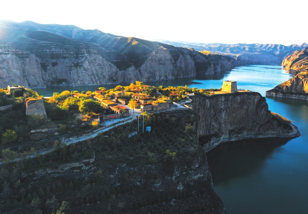 2015年的夏天,我又一次來(lái)到老牛灣,105米高的萬(wàn)家寨水電大壩飛跨晉蒙,黃河水在絕壁中安靜了、變綠了。老牛灣村前的小河倒灌進(jìn)了黃河水,一個(gè)灣成了兩個(gè)灣,團(tuán)團(tuán)地圍住了山村,又好似老牛彎出了兩個(gè)碧綠的牛角,太漂亮了。老鄉(xiāng)們說(shuō):“有企業(yè)來(lái)開(kāi)發(fā)道路、景區(qū)了,也有北京游客開(kāi)車(chē)來(lái)游玩了,拍照的多,照幾張相就走了?!蓖侨匀粴埰频拈T(mén)樓和石板院房,我不知該說(shuō)什么、能說(shuō)什么。
