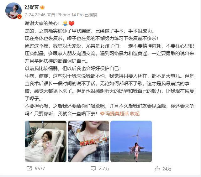 前不久,歌手馮提莫在微博發(fā)文稱自己患甲狀腺癌,經(jīng)手術(shù)已恢復(fù)。她說,通過這個癌,想對大家說,尤其是女孩子們,一定不要精神內(nèi)耗,不要往心里積壓負(fù)能量。