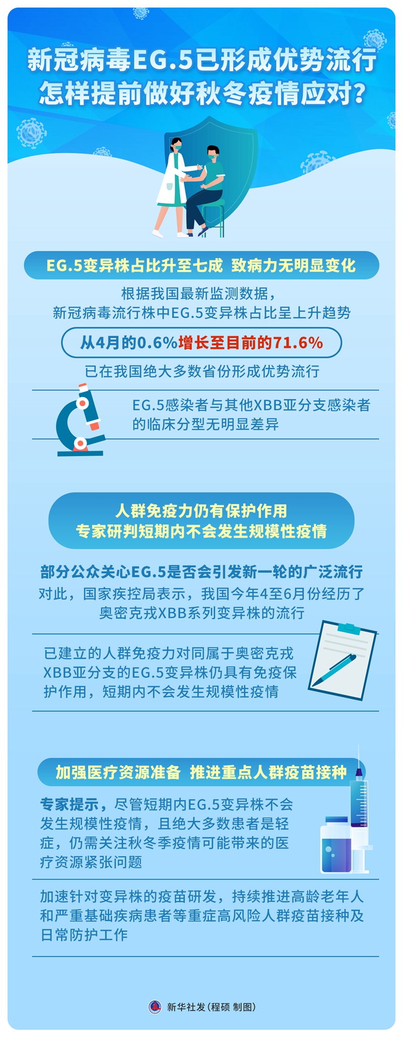 專家提示,盡管短期內(nèi)EG.5變異株不會發(fā)生規(guī)模性疫情,且絕大多數(shù)患者是輕癥,仍需關(guān)注秋冬季疫情可能帶來的醫(yī)療資源緊張問題,加速針對變異株的疫苗研發(fā),持續(xù)推進(jìn)高齡老年人和嚴(yán)重基礎(chǔ)疾病患者等重癥高風(fēng)險人群疫苗接種及日常防護(hù)工作。