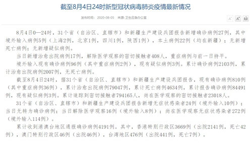 情況顯示,截至8月4日24時,據(jù)31個省(自治區(qū)、直轄市)和新疆生產(chǎn)建設兵團報告,現(xiàn)有確診病例810例(其中重癥病例36例),累計治愈出院病例79047例,累計死亡病例4634例,累計報告確診病例84491例,現(xiàn)有疑似病例3例。累計追蹤到密切接觸者794165人,尚在醫(yī)學觀察的密切接觸者23018人。