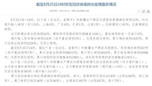 情況顯示,截至8月25日24時(shí),據(jù)31個(gè)省(自治區(qū)、直轄市)和新疆生產(chǎn)建設(shè)兵團(tuán)報(bào)告,現(xiàn)有確診病例347例(其中重癥病例7例),累計(jì)治愈出院病例80015例,累計(jì)死亡病例4634例,累計(jì)報(bào)告確診病例84996例,無(wú)現(xiàn)有疑似病例。累計(jì)追蹤到密切接觸者813062人,尚在醫(yī)學(xué)觀察的密切接觸者11915人。
