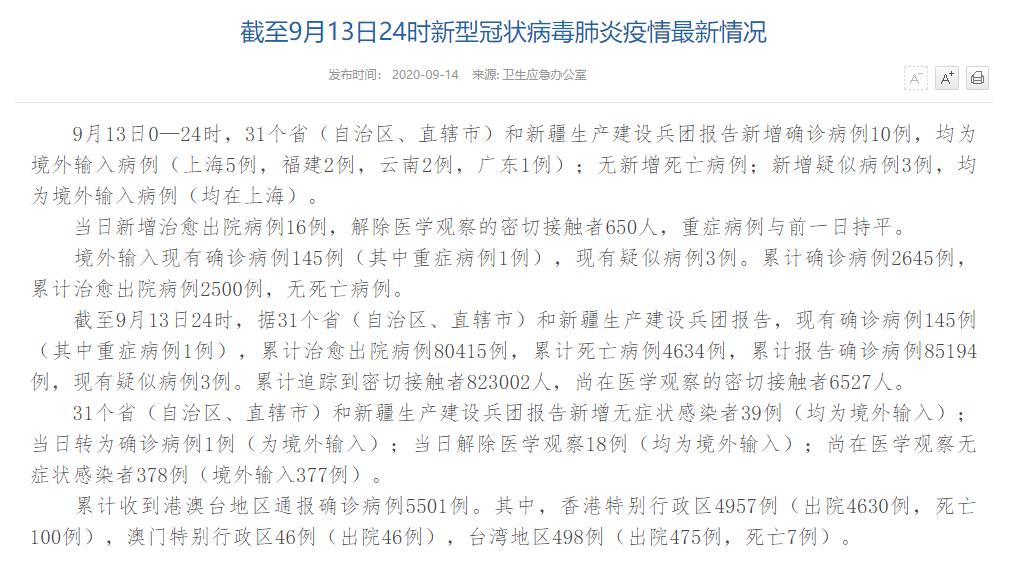 人民網(wǎng)北京9月14日(董童)國家衛(wèi)生健康委于今日在官網(wǎng)發(fā)布的《截至9月13日24時新型冠狀病毒肺炎疫情最新情況》(以下簡稱“情況”)提出,9月13日0—24時,31個省(自治區(qū)、直轄市)和新疆生產(chǎn)建設(shè)兵團報告新增確診病例10例,均為境外輸入病例(上海5例,福建2例,云南2例,廣東1例);無新增死亡病例;新增疑似病例3例,均為境外輸入病例(均在上海)。當日新增治愈出院病例16例,解除醫(yī)學(xué)觀察的密切接觸者650人,重癥病例與前一日持平。