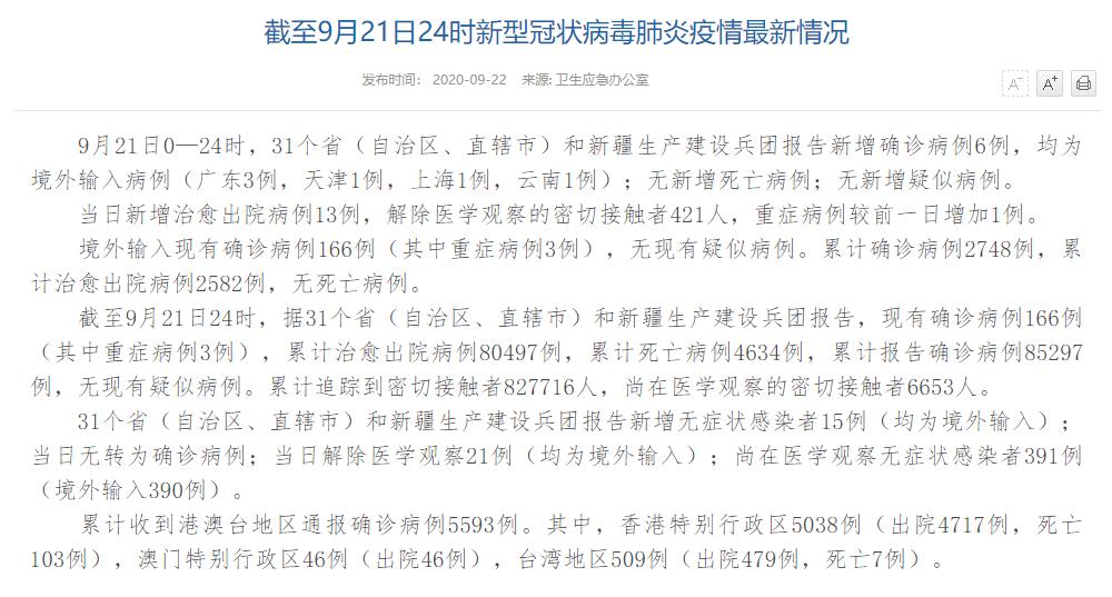 情況顯示,截至9月21日24時,據(jù)31個?。ㄗ灾螀^(qū)、直轄市)和新疆生產(chǎn)建設兵團報告,現(xiàn)有確診病例166例(其中重癥病例3例),累計治愈出院病例80497例,累計死亡病例4634例,累計報告確診病例85297例,無現(xiàn)有疑似病例。累計追蹤到密切接觸者827716人,尚在醫(yī)學觀察的密切接觸者6653人。