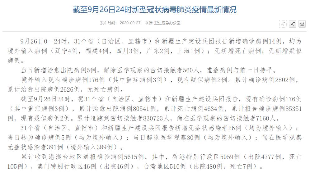人民網(wǎng)北京9月27日電(董童)國家衛(wèi)生健康委于今日在官網(wǎng)發(fā)布的《截至9月26日24時新型冠狀病毒肺炎疫情最新情況》(以下簡稱“情況”)提出,9月26日0—24時,31個?。ㄗ灾螀^(qū)、直轄市)和新疆生產(chǎn)建設兵團報告新增確診病例14例,均為境外輸入病例(遼寧4例,福建4例,四川3例,廣東2例,上海1例);無新增死亡病例;無新增疑似病例。當日新增治愈出院病例5例,解除醫(yī)學觀察的密切接觸者560人,重癥病例與前一日持平。