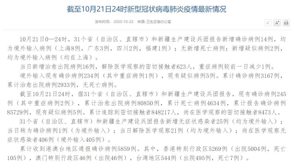 人民網(wǎng)北京10月22日電(董童)國(guó)家衛(wèi)生健康委于今日在官網(wǎng)發(fā)布的《截至10月21日24時(shí)新型冠狀病毒肺炎疫情最新情況》(以下簡(jiǎn)稱(chēng)“情況”)提出,10月21日0—24時(shí),31個(gè)?。ㄗ灾螀^(qū)、直轄市)和新疆生產(chǎn)建設(shè)兵團(tuán)報(bào)告新增確診病例14例,均為境外輸入病例(上海8例,廣東3例,四川2例,福建1例);無(wú)新增死亡病例;新增疑似病例2例,均為境外輸入病例(均在上海)。當(dāng)日新增治愈出院病例16例,解除醫(yī)學(xué)觀(guān)察的密切接觸者623人,重癥病例較前一日減少1例。