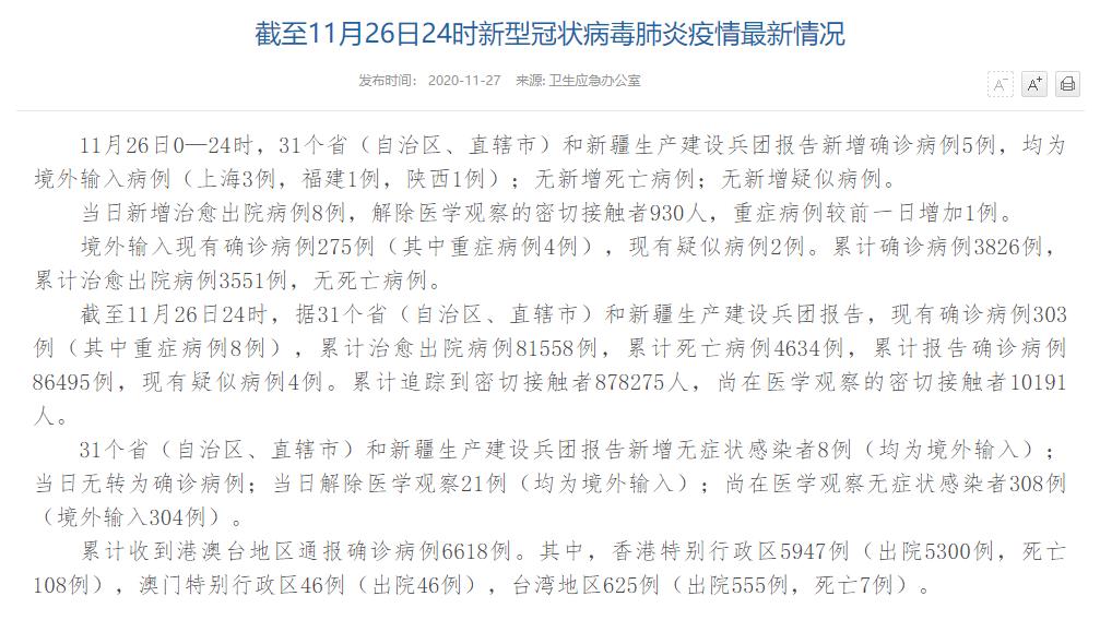 人民網(wǎng)北京11月27日電(董童)國家衛(wèi)生健康委于今日在官網(wǎng)發(fā)布的《截至11月26日24時新型冠狀病毒肺炎疫情最新情況》(以下簡稱“情況”)指出,11月26日0—24時,31個?。ㄗ灾螀^(qū)、直轄市)和新疆生產(chǎn)建設兵團報告新增確診病例5例,均為境外輸入病例(上海3例,福建1例,陜西1例);無新增死亡病例;無新增疑似病例。當日新增治愈出院病例8例,解除醫(yī)學觀察的密切接觸者930人,重癥病例較前一日增加1例。