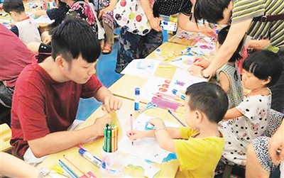 圖為臺灣實(shí)習(xí)生在北京首都圖書館少兒閱覽室教小朋友做手工。李晗雪 攝